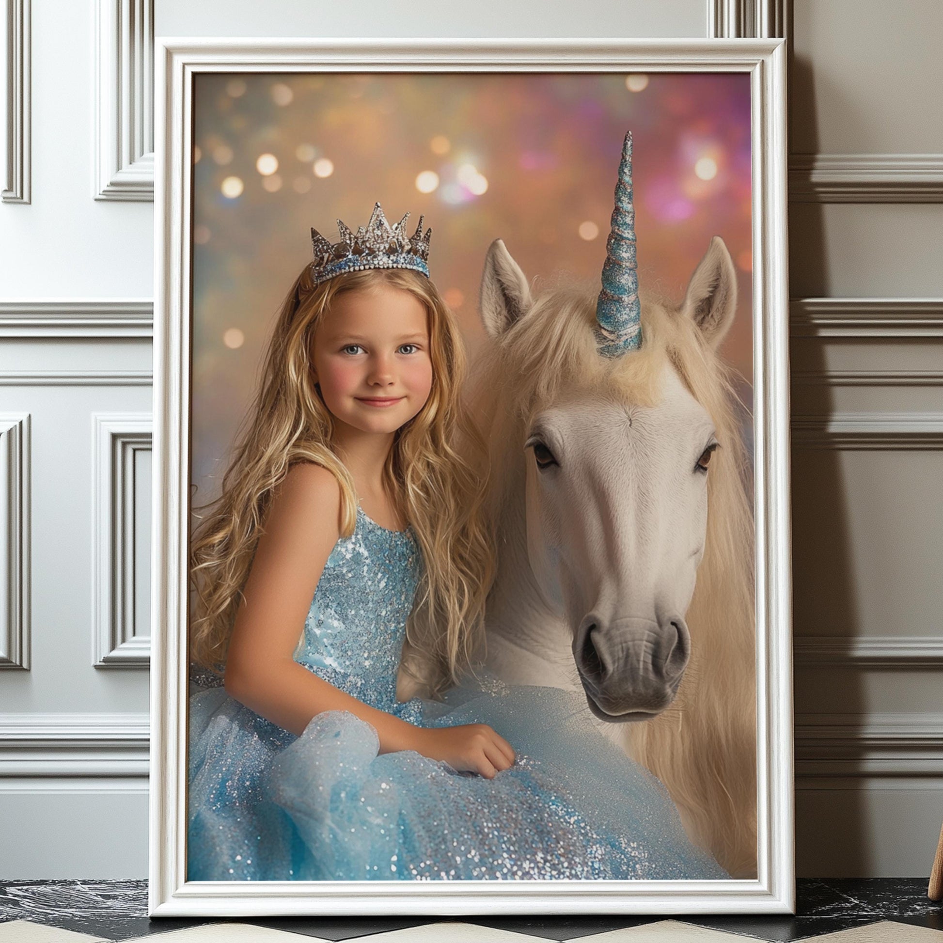 Give your little girl the most enchanting gift everāa custom portrait of her as a princess alongside a majestic unicorn in a dreamy fairytale setting. Whether itās for her birthday, a holiday surprise, or just because, this personalized artwork will spark her imagination and light up her world.